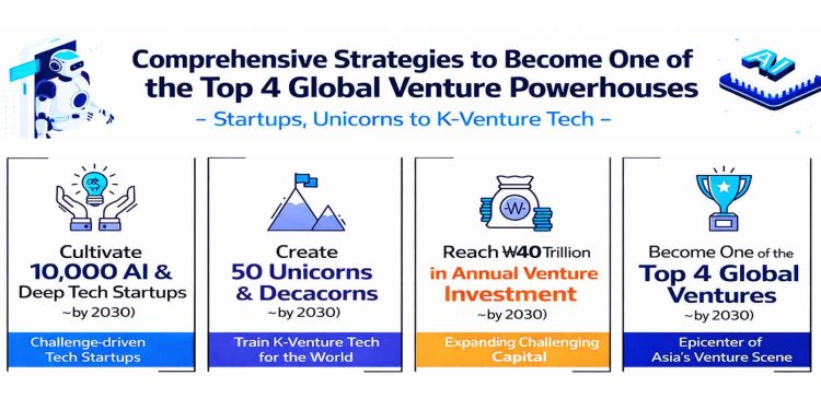 The comprehensive roadmap, titled “Leap into the Top Four Global Venture Nations,” outlines the government’s plan to cultivate 10,000 AI and deep-tech startups, produce 50 unicorns and decacorns, and expand the venture investment market to KRW 40 trillion annually.